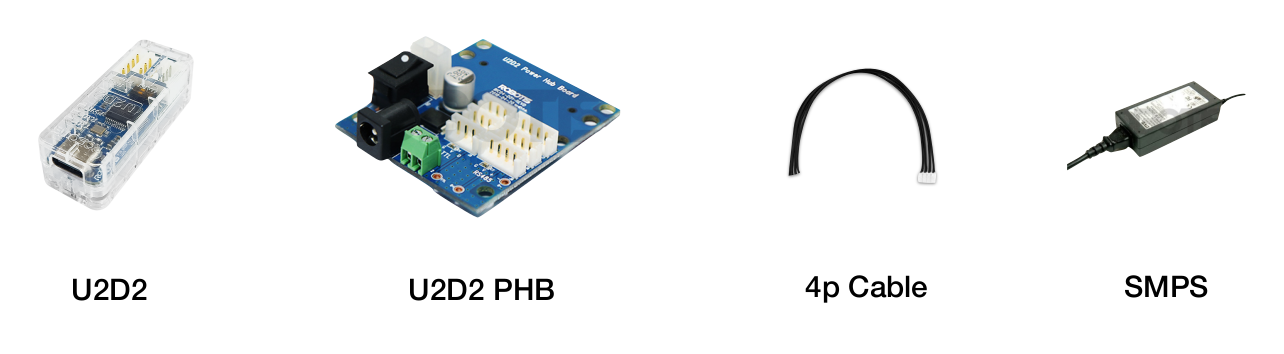 | U2D2 Power Hub | 1 | The U2D2 Power Hub Board combines with the U2D2 to supply a variety of external power sources to DYNAMIXELs | Link |