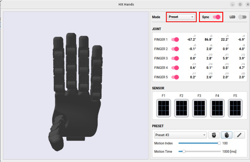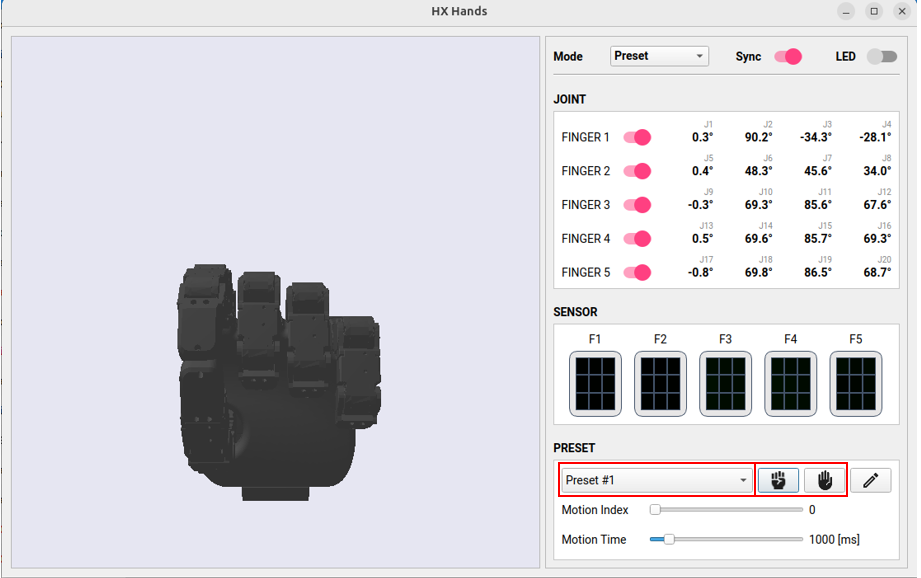Once presets are saved, you can instantly apply them to control the ROBOTIS Hand:
